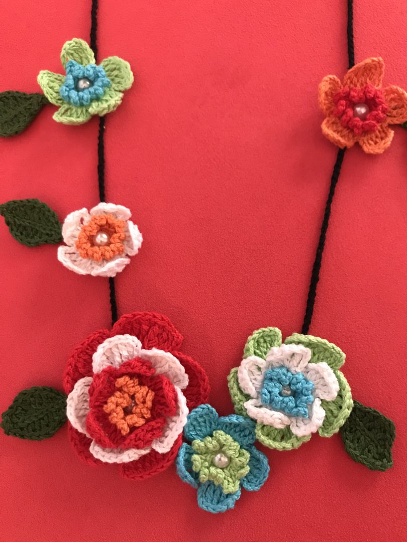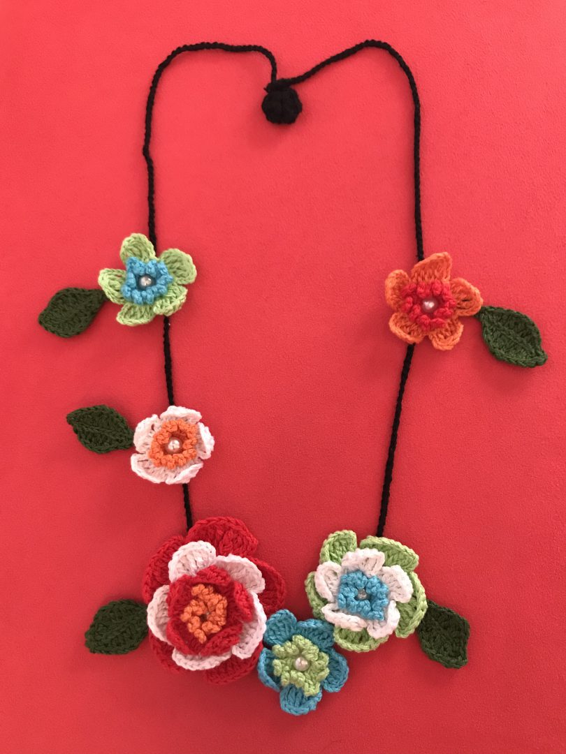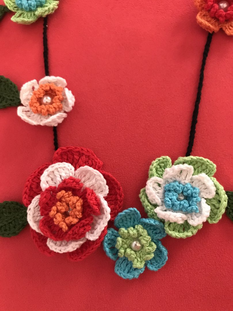 Las medidas son 80cm todo el contorno de la cadena a eso hay que añadir la medida de la flor central. Luce precioso sobre prendas sencillas, camisas, camisetas.